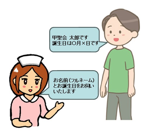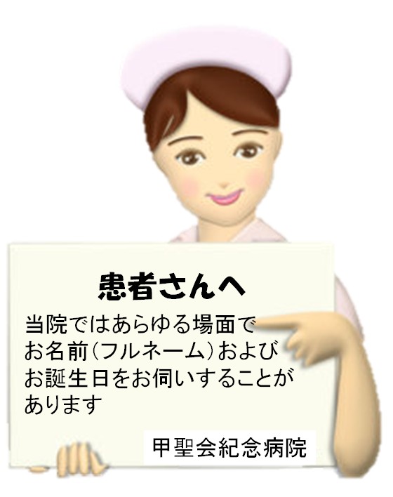 当院では患者さんのお名前の確認を職員が直接確認させていただく『直接聞く確認方法』とさせていただいております。患者さんからお名前を職員にお伝えいただきますようお願いいたします。
