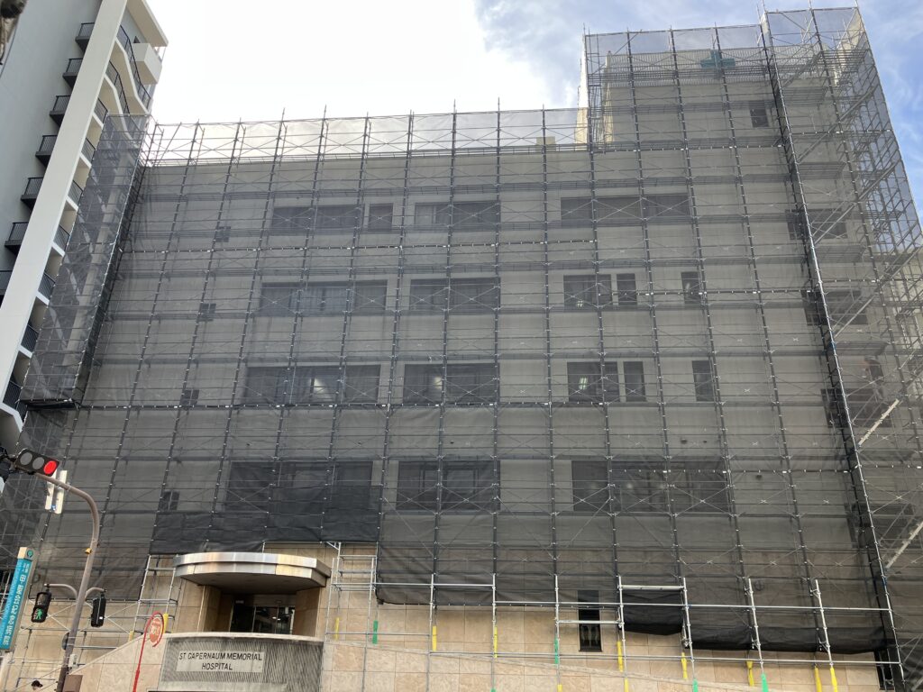 ご迷惑をおかけして申し訳ありませんが、只今大規模改修工事(外壁工事)を実施しております。